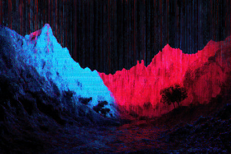 Digitally distorted landscape with color-shifted mountains and silhouetted creatures