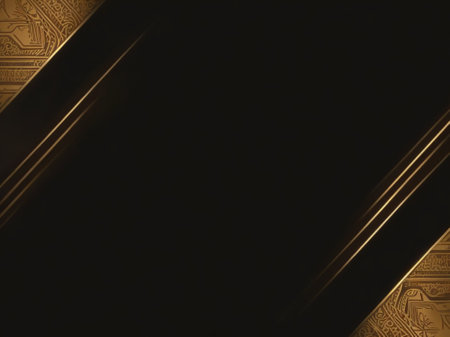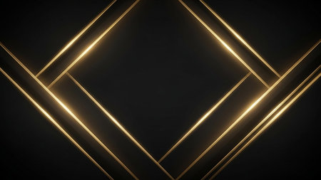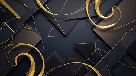 This image features a striking composition of geometric shapes and lines, accented with golden embellishments. The dark background contrasts sharply with the golden elements, creating a sense of depth and sophistication. The intricate patterns and symmetrical designs evoke a sense of elegance and modernity.