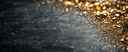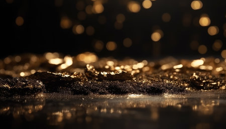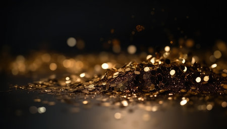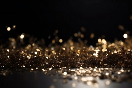 Golden sparkles cover a dark surface reflecting light and creating an enchanting display.