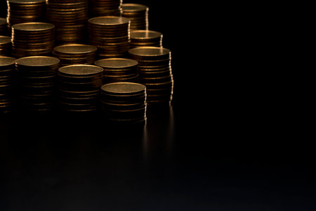 Pile of coins stacked on black background.