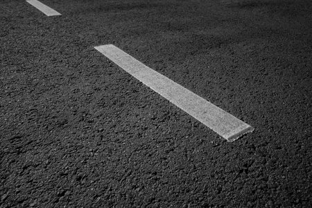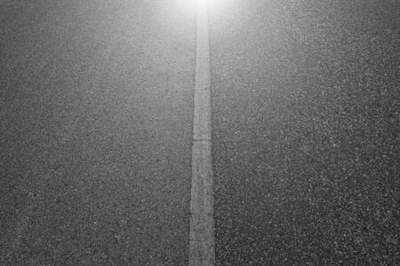The texture of a new asphalt road with a dividing white stripe on a sunny morning