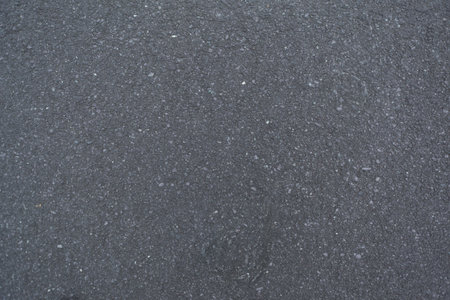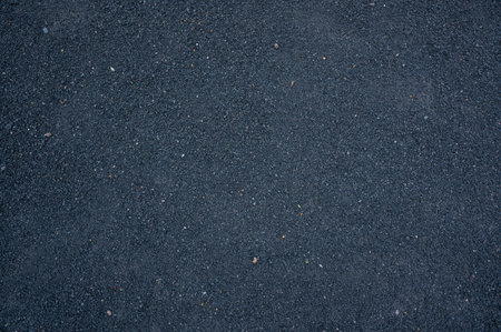 Low angle view of a newly paved asphalt road, focusing on the texture and small stones, with a blurred background. Suitable for themes related to travel, road construction, and transportation.