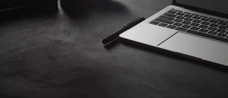 Dark luxury workplace with copy space laptop computer and office supplies on black leather background