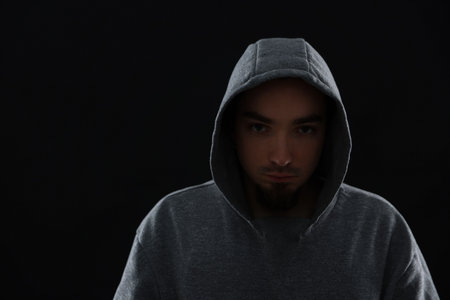 Male brutal face. Young handsome man with a beard in a gray fashionable hoodie stands on a black background
