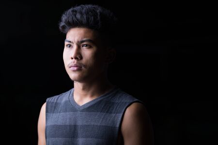 one young man, 20-25 years, moody dark portrait, profile. studio shot, gray background. head and shoulders shot.