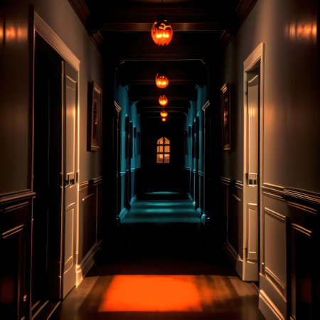 A dimly lit corridor stretches ahead, lined with wooden doors and inviting an air of suspense and curiosity during night time.