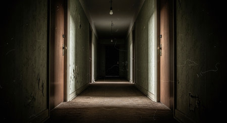 A long, dimly lit hallway with doors on either side, leading to a bright exit at the end, creating a sense of depth and mystery