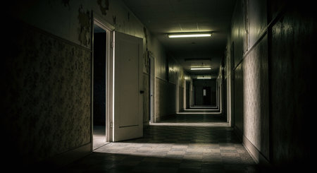 Eerie empty asylum hallway, silent and chilling