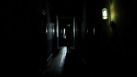 A dark corridor reveals shadowy figures lurking in the flickering light, enhancing the sense of dread and suspense in this horror setting.