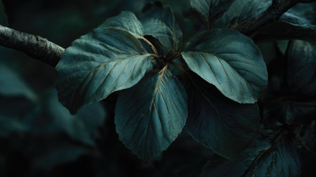AI generated dark toned leaves with delicate vein patterns creating a calm mysterious natural luxury mood suitable for backgrounds fashion design and artistic visuals