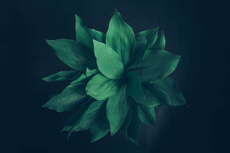 Deep faded green leaves background. Creative layout. Toned image filter. Black and green.