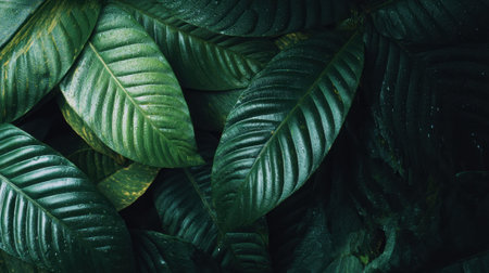 Green leaves texture background. Dense dark green leaves in jungle. Nature abstract background. Plant in tropical forest. Exotic plant in garden. Organic wallpaper. Foliage pattern. Tropical greenery.