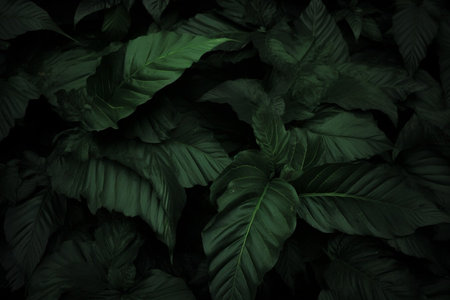 Dark green tropical leaves background – Toned nature shot of some forest greenery – Dramatic foliage decoration
