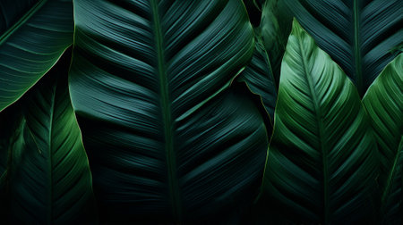 Close-up of large, vibrant green tropical leaves. Lush foliage background image.