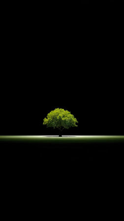 A single tree with vibrant green foliage is centered against a stark black backdrop. The scene incorporates a horizontal line of green, adding a sense of depth. The image displays a minimalist style with high contrast, suggesting potential use in various design projects or visual storytelling.