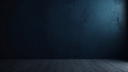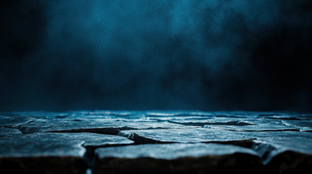 Studio showing dark blue textured surface meeting a deep black horizon line in a minimalist studio setting with...