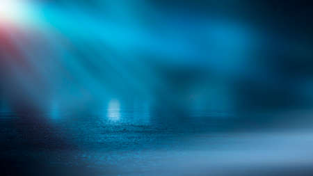 Dark street wet asphalt reflections of rays in the water Abstract dark blue background smoke smog Empty dark scene neon light spotlights