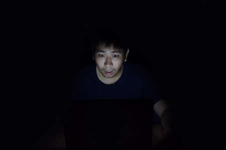Close up man hand typing keyboard on laptop in darkness operating room, cyber security concept. Hacker using laptop.