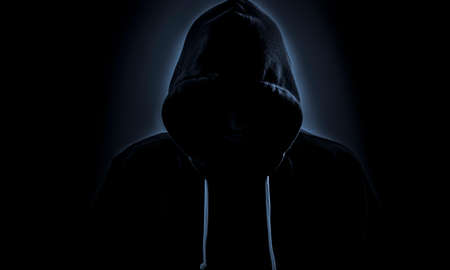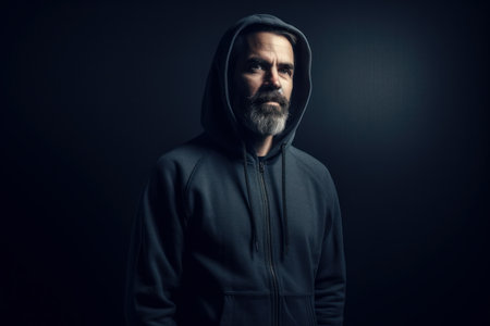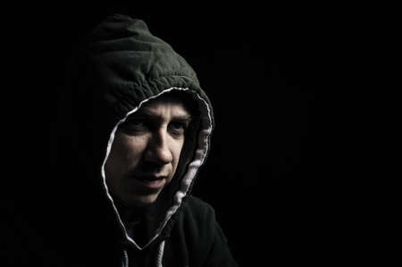 Dark shadowy portrait of a bearded man wearing a hooded top staring intently at the camera with a focused determined expression