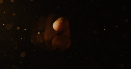 Close up of an index finger pointing in dark background with golden dust particles illuminated by light.