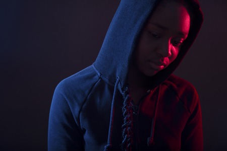 Colorful portrait of thoughtful woman with dark skin wearing hoodie