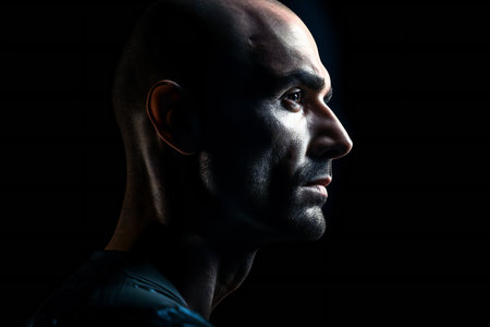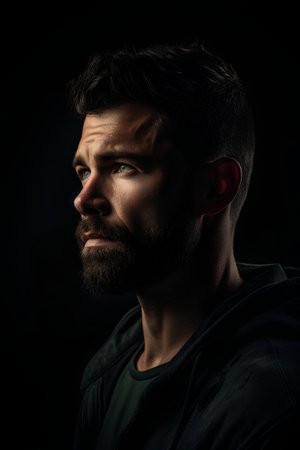 Half-body realistic portrait of a young man seen from the side, moody low light, cinematic realism with sharp contrasts