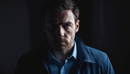 portrait of a bearded man with an intense look standing in a dark room against a black background