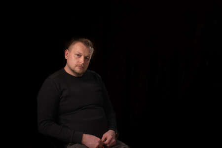 Portrait of a young man with a beard sitting on a chair. dark background. A slightly overweight man with a large build. Interview, confidential dialogue concept.