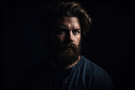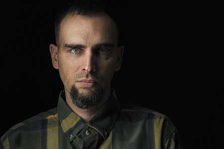 Dramatic portrait of a bearded man against a black background. Handsome man in a checked shirt in an understated pose. close-up. The man looks into the camera