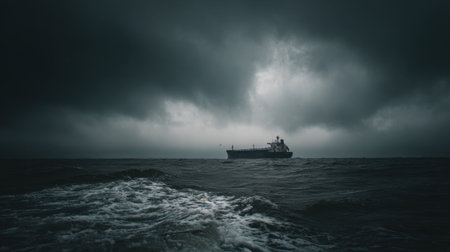 Aerial view of a large battleship at full speed amidst huge waves with city skyline background