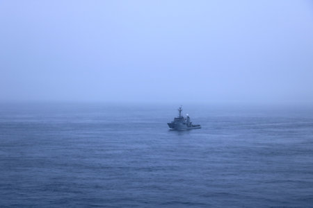 Ship in sea storm. Storm at Baltic sea. Warship training in the Baltic Sea during a storm. NATO military ship in Baltic sea, Latvia. NATO military ship at sea during a storm. view from ships the bow.