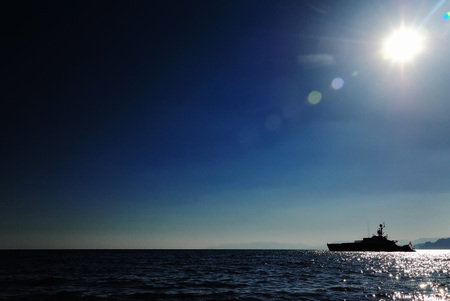 Luxury big yacht on holiday at sunset near the shore of the mountain, silhouette photo in blue tones