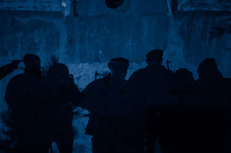 War Concept. Military silhouettes fighting scene on war fog sky background, World War Soldiers Silhouette Below Cloudy Skyline At night. Armored vehicle fight scene. Selective focus