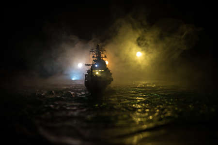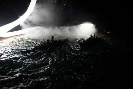 War concept. Night battle scene at sea. Dramatic toned clouds effect. Silhouette of the battle ship in night. Miniature creative table decoration. Selective focus