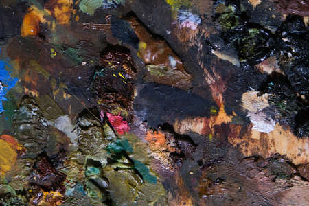 Background of an artist's palette with mixed dried acrylic paints. An abstract artwork.