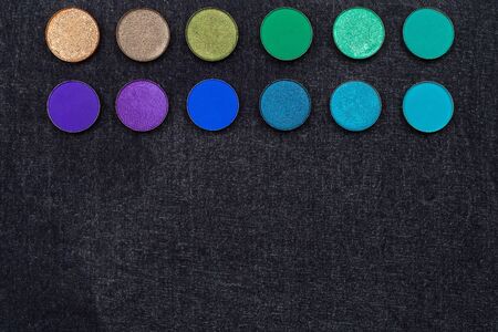 Set of shimmer and matt multicolored circle shaped eye shadows in straight rows on a black