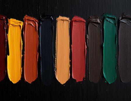 A stunning array of vibrant paint colors arranged in a line, with drips cascading down a textured black background, showcasing artistic potential and creativity.