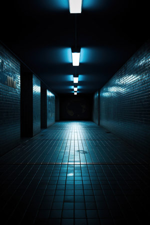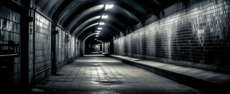 Shady underground tunnel near subway station illuminated by artificial lamp lights.