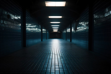 Empty underground pedestrian tunnel with tiled walls and ceiling, fluorescent lights creating vanishing point perspective in urban subway passage.