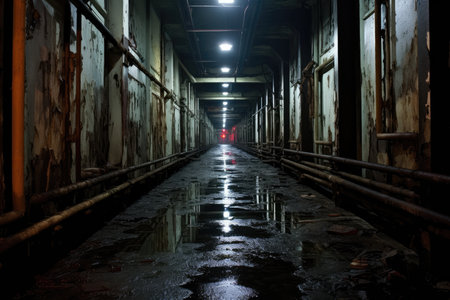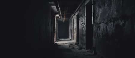 Long dark eerie, grunge, dark and dirty corridor in an abandoned property, with dirty interior and dimmed lighting condition, good for multimedia content creation