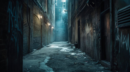Dark, narrow alleyway dimly lit by a single light source