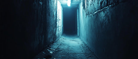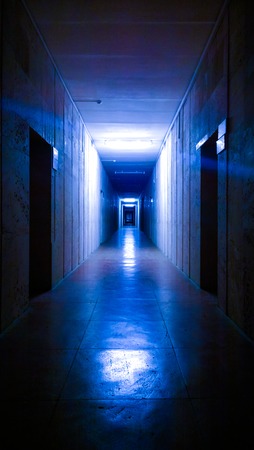 End of dark tunnel with magic blue light. Vertical view. Empty dark corridor in hospital laboratory. Blue light at the end of a dark corridor.