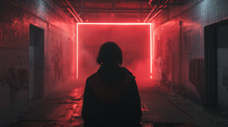 A girl in a dark abandoned building with a red neon light