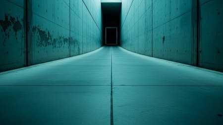 An atmospheric and futuristic concrete corridor stretches into the distance, bathed in an eerie teal light. The smooth, geometric walls and floor create a sense of depth and perspective, leading towards a dark, ominous opening at the vanishing point. The stark lighting and minimalist evoke a feeling of mystery and intrigue, suggesting a journey into the unknown.
