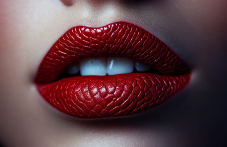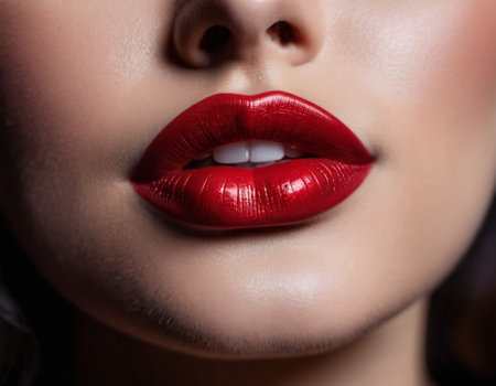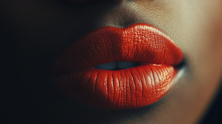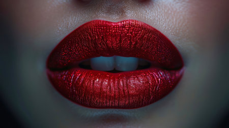 Close-up shot of vibrant red lips, showcasing texture and shine, perfect for beauty campaigns or cosmetic promotions, conveying elegance and confidence.