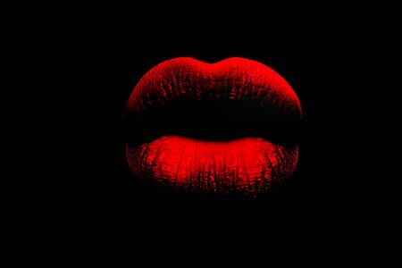 Red full lips on black background. The womans lips. Lush lips like a kiss. Red and pouting. Erotica, sex, temptation.