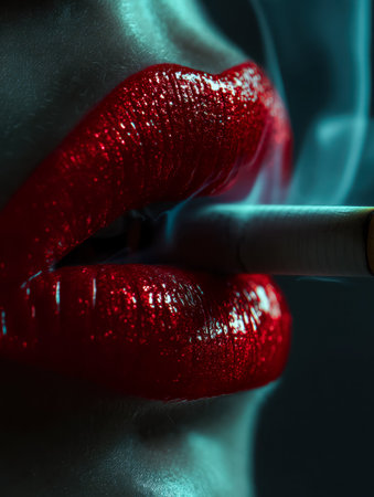 Vibrant crimson lips glisten under dim lighting, grasping a slender cigarette amidst a shadowy, intense atmosphere that exudes allure and mystery.