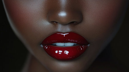 Glossy lips glisten with a rich, shiny finish, creating a striking contrast against a dark backdrop that emphasizes their allure.