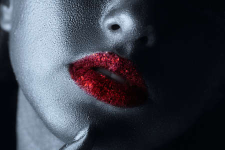 Close-up portrait of a female face with metallic silver skin and bright red lips with glitter. Fashion makeup, Glittering lips. Body painting, body art. Beauty and cosmetics concept.