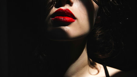 A woman partially in shadow, her red lips the focal point of the image, embodies a femme fatale character. Her anonymity and the dark ambiance create an aura of mystery and allure